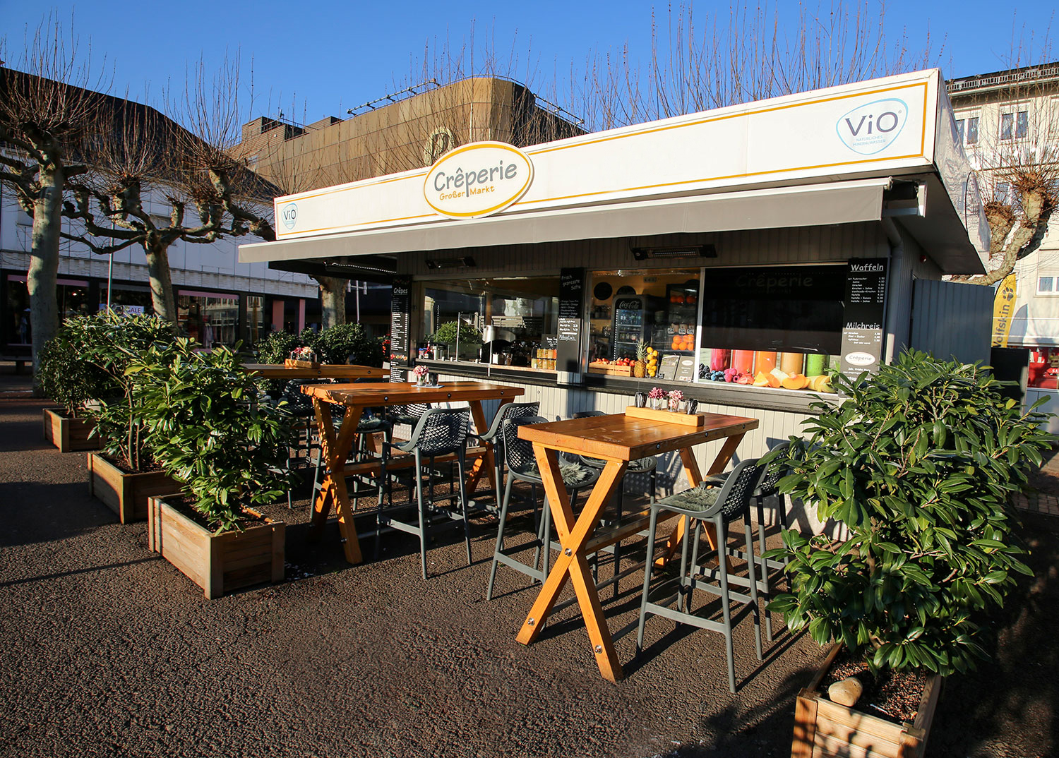 Besonders zur Mittagszeit sind unsere hausgemachten Suppen und Salate ein echtes Highlight. Schnappt euch einen Platz an unseren Stehtischen oder macht es euch unter unserer wettergeschützten Überdachung gemütlich. Schnell erreichbar, immer frisch und einfach lecker. <<